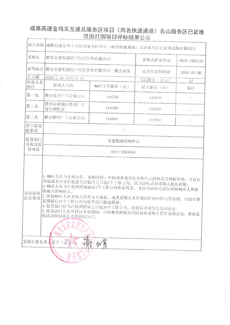 雅安交建集團(tuán)資產(chǎn)經(jīng)營管理有限公司成雅高速金雞關(guān)互通及服務(wù)區(qū)項(xiàng)目(雨名快速通道)名山服務(wù)區(qū)已征地范圍打圍項(xiàng)目評(píng)標(biāo)結(jié)果公示