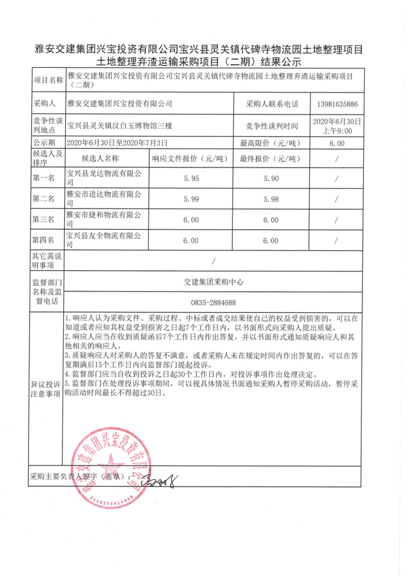 雅安交建集團興寶投資有限公司寶興縣靈關(guān)鎮(zhèn)代碑寺物流園土地整理項目土地整理棄渣運輸采購項目(二期)結(jié)果公示