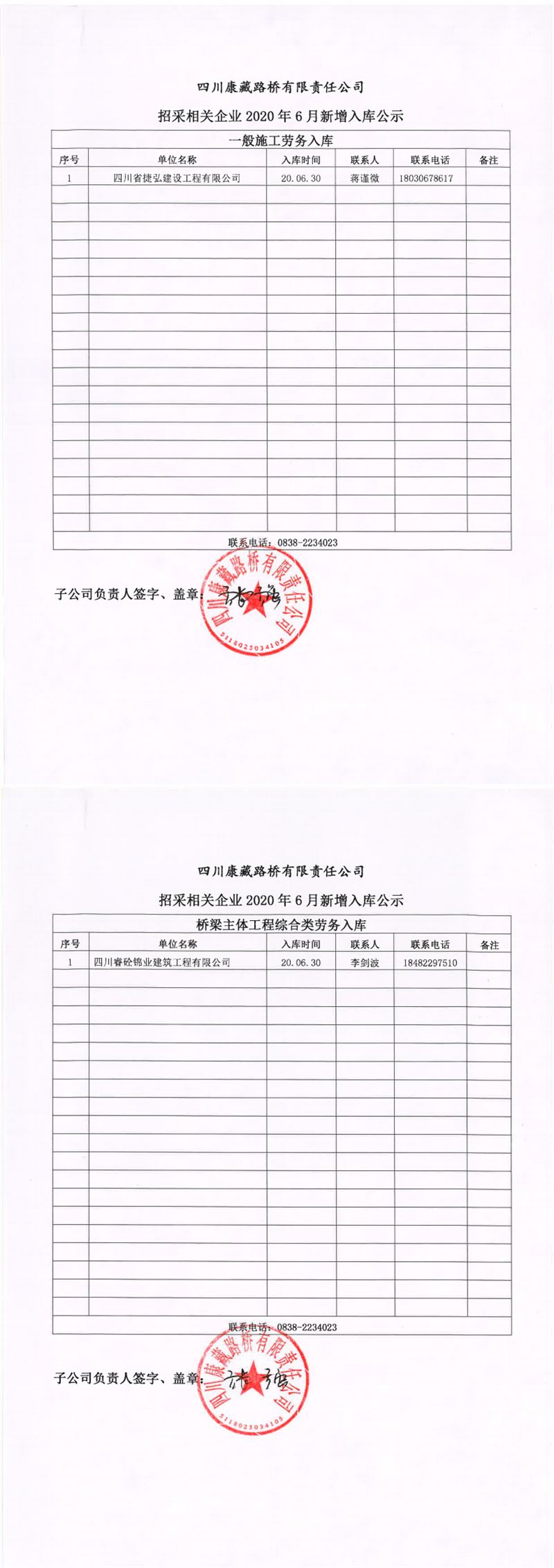 四川康藏路橋有限責(zé)任公司招采相關(guān)企業(yè)2020年6月新增入庫公示