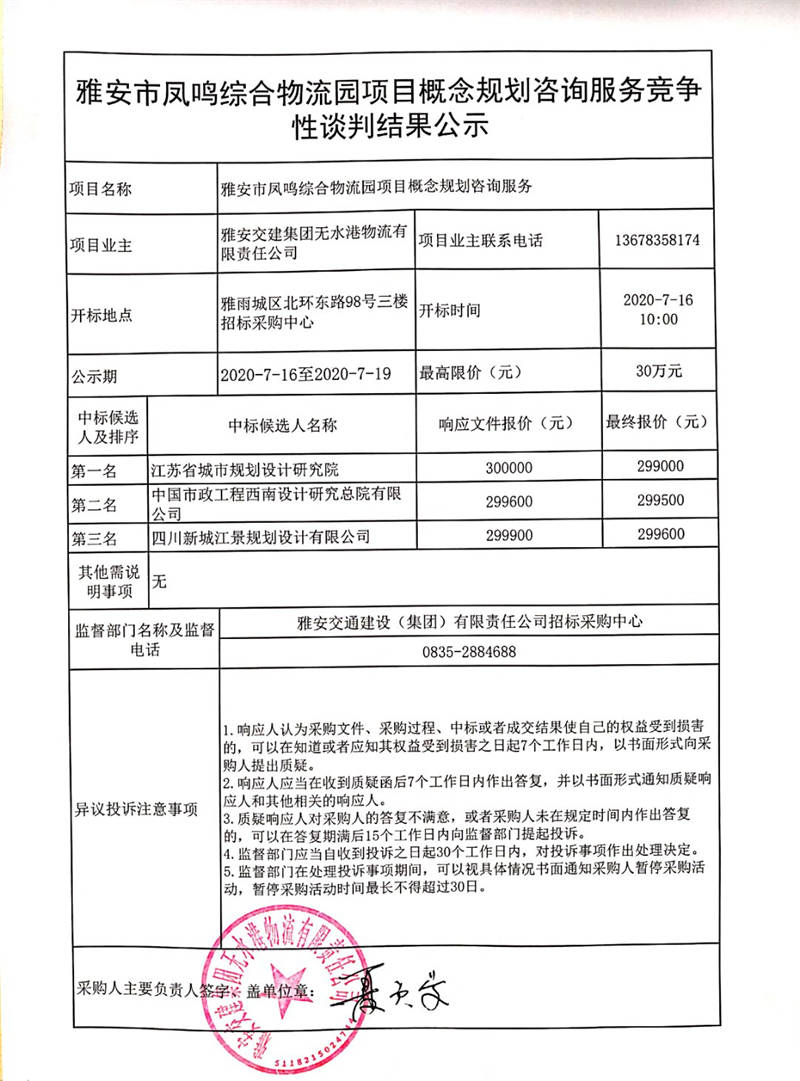 雅安交建集團(tuán)無(wú)水港物流有限責(zé)任公司雅安市鳳鳴綜合物流園項(xiàng)目概念規(guī)劃咨詢服務(wù)競(jìng)爭(zhēng)性談判結(jié)果公示
