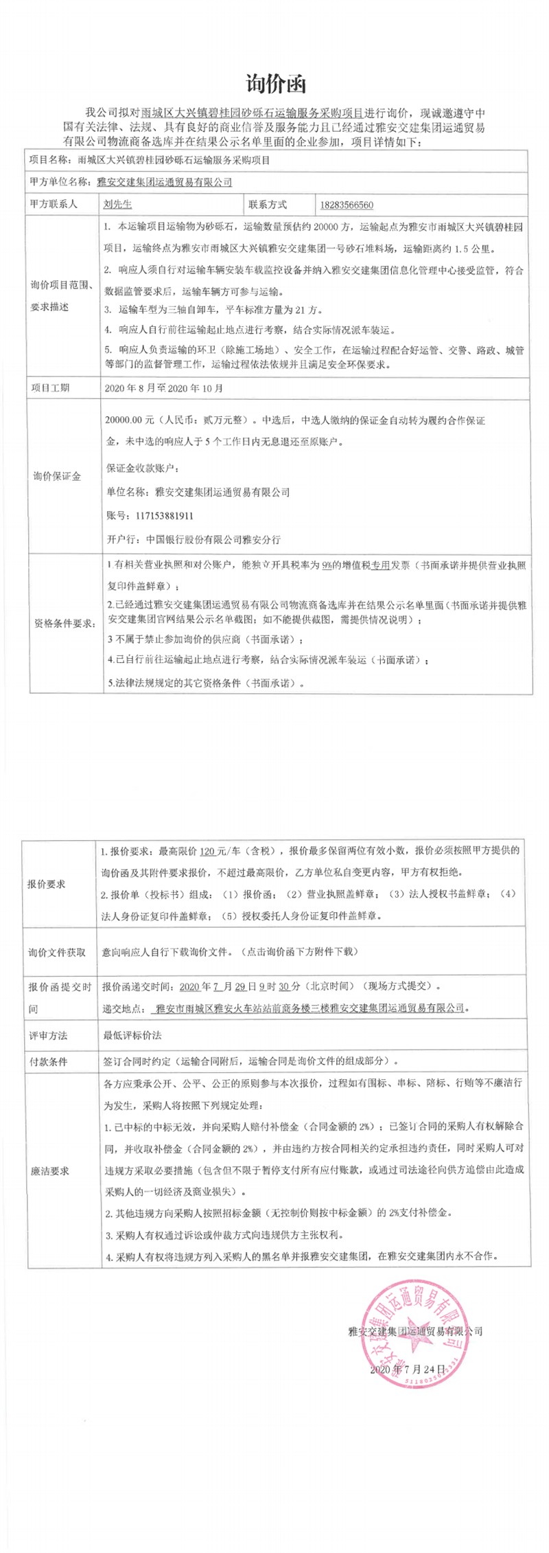 雅安交建集團運通貿易有限公司雨城區(qū)大興鎮(zhèn)碧桂園砂礫石運輸服務采購項目詢價函