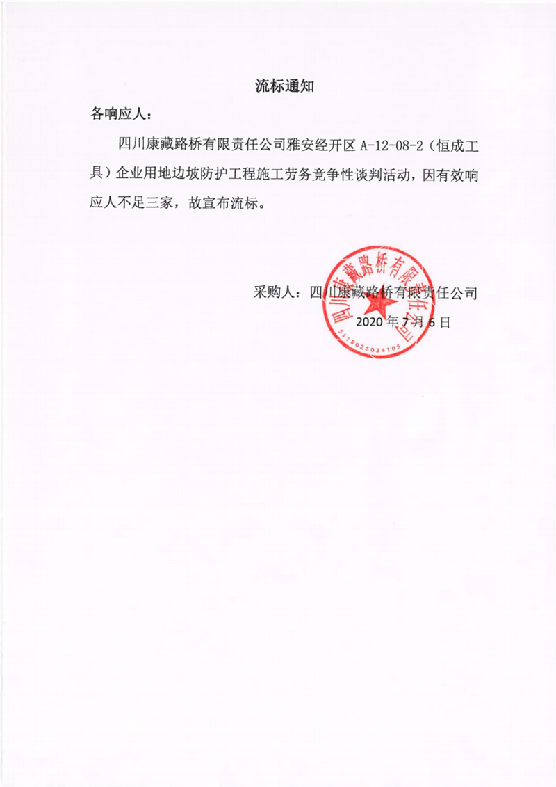 四川康藏路橋有限責任公司雅安經(jīng)開區(qū)A-12-08-2(恒成工具)企業(yè)用地邊坡防護工程施工勞務流標通知