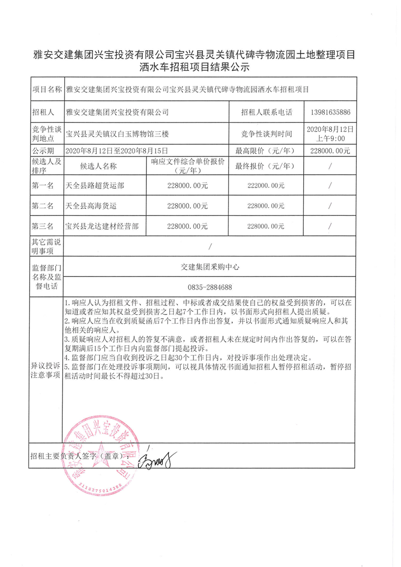 雅安交建集團(tuán)興寶投資有限公司寶興縣靈關(guān)鎮(zhèn)代碑寺物流園灑水車招租項目結(jié)果公示
