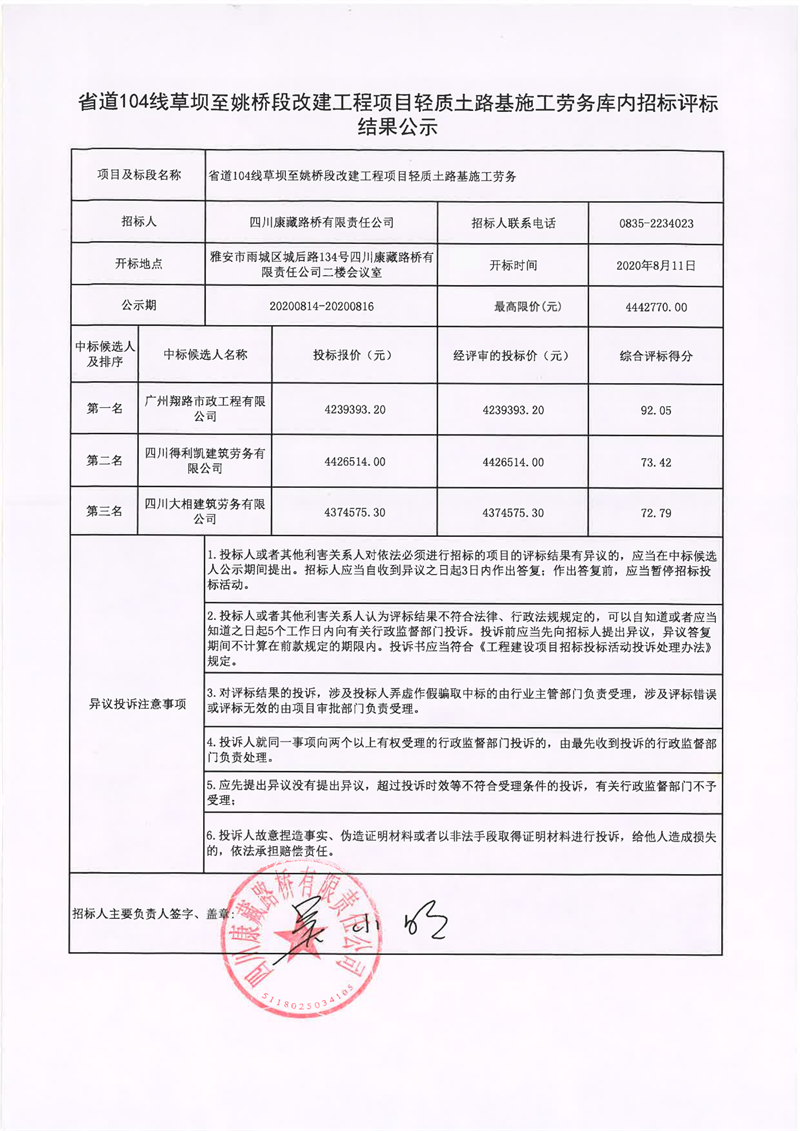 四川康藏路橋有限責任公司省道104線草壩至姚橋段改建工程項目輕質土路基施工勞務庫內招標評標結果公示