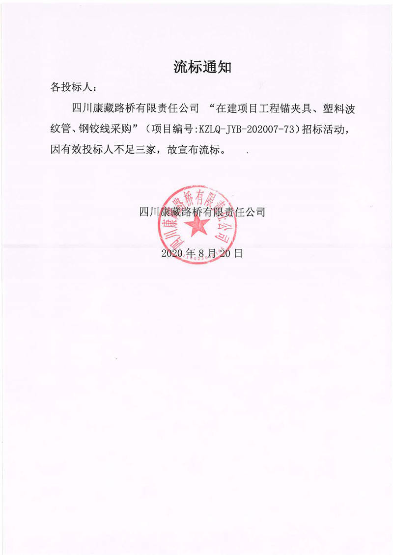 四川康藏路橋有限責(zé)任公司在建項目工程錨夾具、塑料波紋管、鋼鉸線采購流標通知
