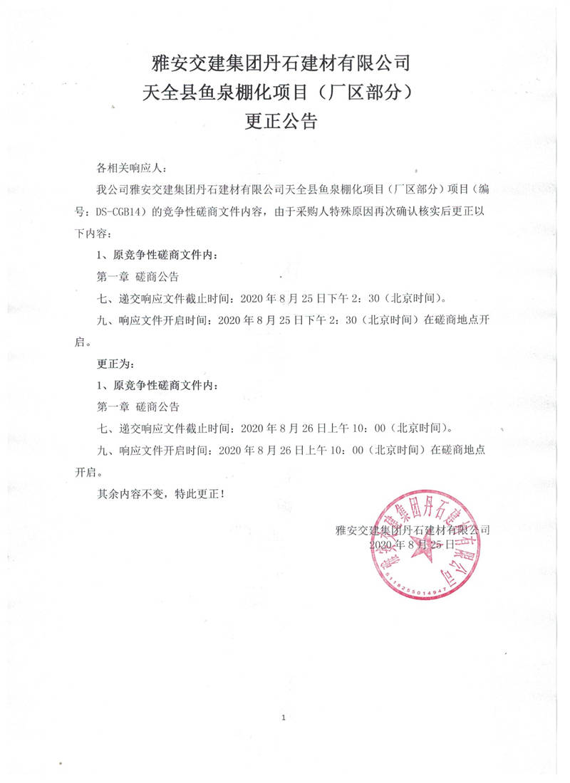 雅安交建集團(tuán)丹石建材有限公司天全縣魚泉棚化項(xiàng)目(廠區(qū)部分)更正公告