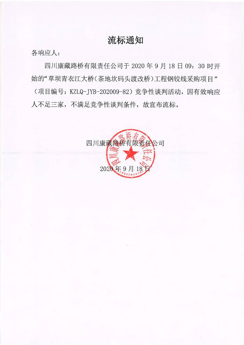 四川康藏路橋有限責(zé)任公司草壩青衣江大橋(茶地坎碼頭渡改橋)工程鋼鉸線采購(gòu)項(xiàng)目流標(biāo)通知