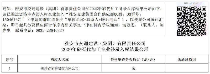 雅安市交通建設(集團)有限責任公司2020年砂石代加工企業(yè)補錄入庫結(jié)果公示