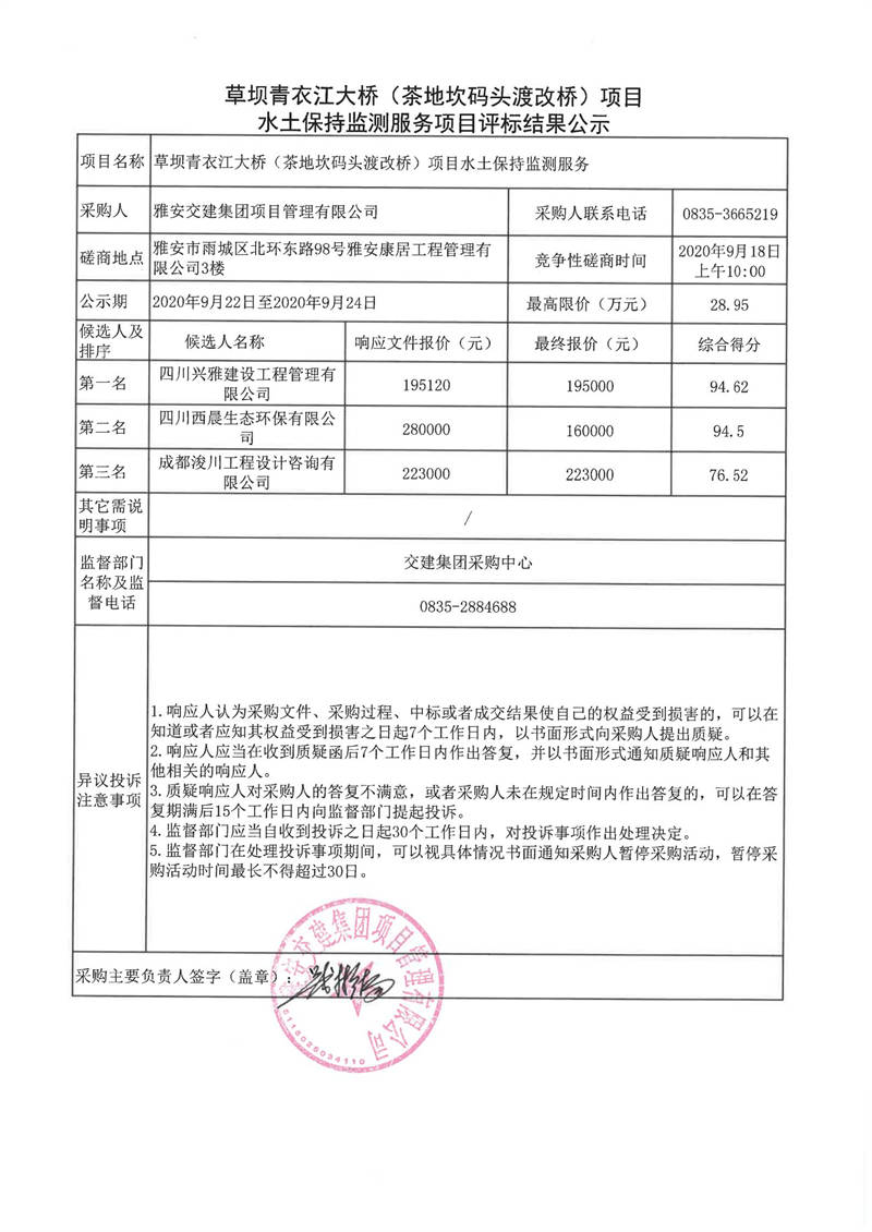 雅安交建集團項目管理有限公司草壩青衣江大橋(茶地坎碼頭渡改橋)項目水土保持監(jiān)測服務項目評標結果公示
