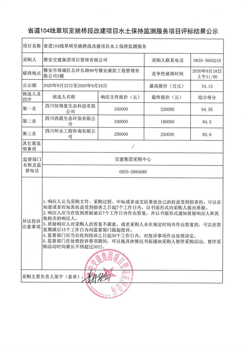 雅安交建集團(tuán)項(xiàng)目管理有限公司省道104線草壩至姚橋段改建項(xiàng)目水土保持監(jiān)測服務(wù)項(xiàng)目評標(biāo)結(jié)果公示