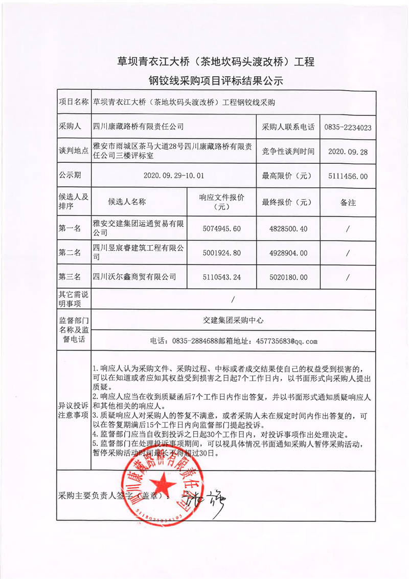 四川康藏路橋有限責(zé)任公司草壩青衣江大橋(茶地坎碼頭渡改橋)工程鋼鉸線采購項(xiàng)目評標(biāo)結(jié)果公示