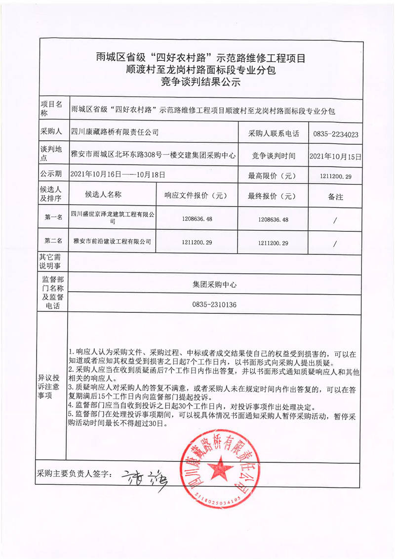 四川康藏路橋有限責(zé)任公司雨城區(qū)省級(jí)“四好農(nóng)村路”示范路維修工程項(xiàng)目順渡村至龍崗村路面標(biāo)段專(zhuān)業(yè)分包競(jìng)爭(zhēng)談判結(jié)果公示