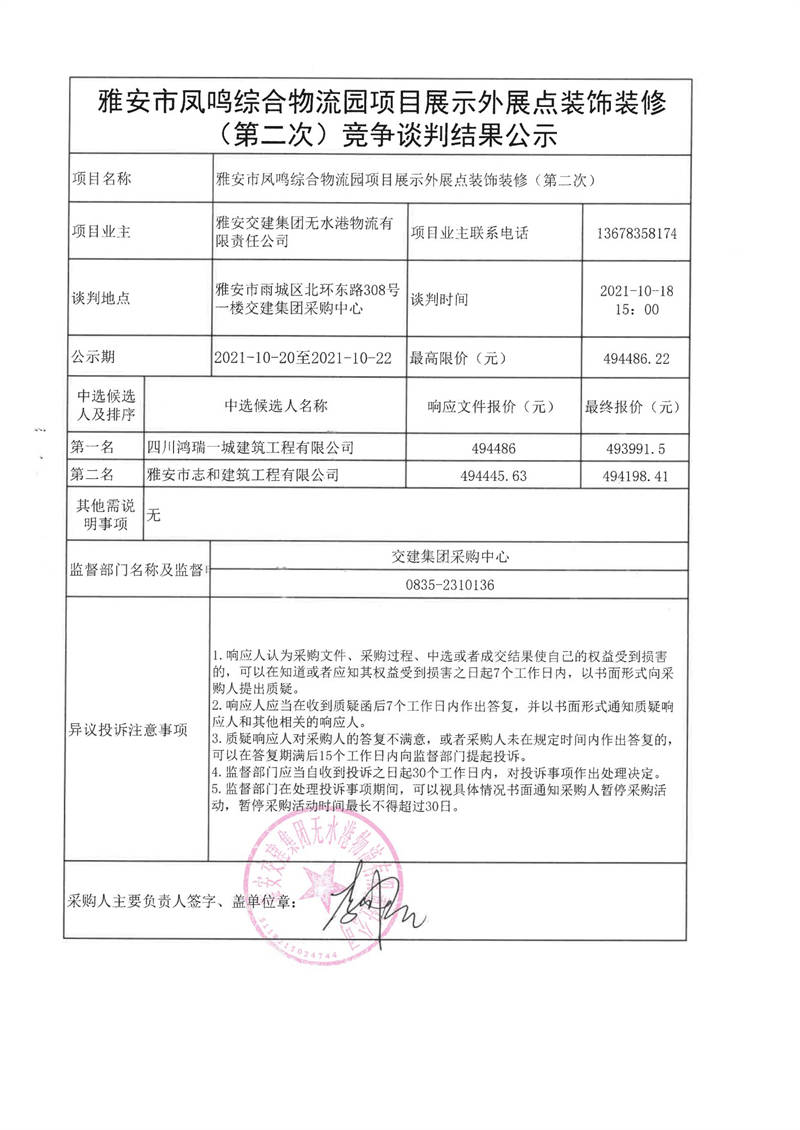 雅安交建集團無水港物流有限責任公司雅安市鳳鳴綜合物流園項目展示外展點裝飾裝修(第二次)競爭談判結果公示