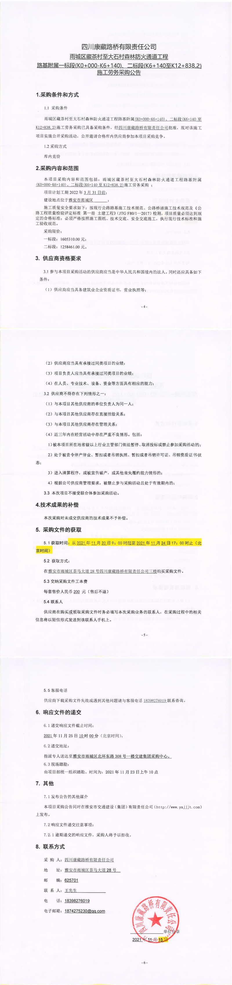 四川康藏路橋有限責任公司雨城區(qū)藏茶村至大石村森林防火通道工程路基附屬一標段(K0+000-K6+140)、二標段(K6+140至K12+838.2)施工勞務采購公告