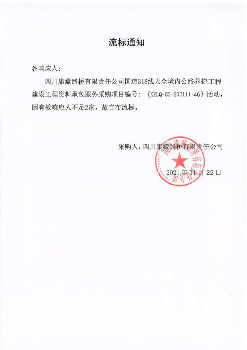 四川康藏路橋有限責任公司國道318線天全境內(nèi)公路養(yǎng)護工程建設(shè)工程資料承包服務(wù)采購流標通知