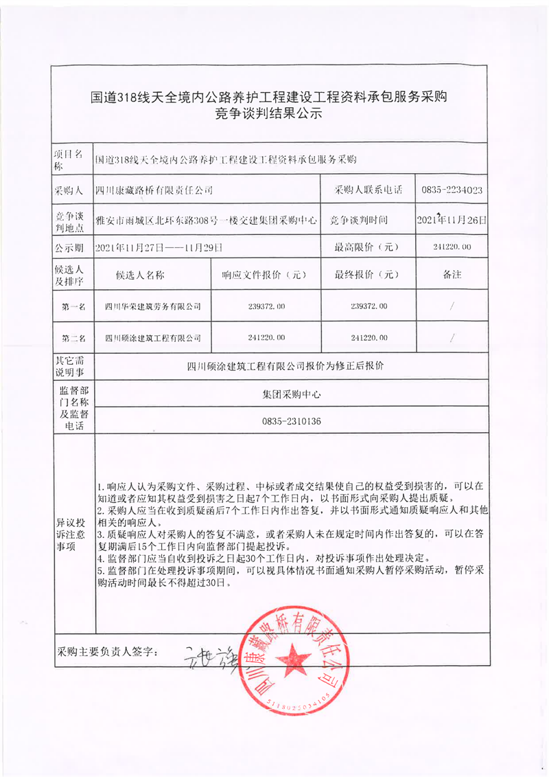 四川康藏路橋有限責(zé)任公司國道318線天全境內(nèi)公路養(yǎng)護工程建設(shè)工程資料承包服務(wù)采購競爭談判結(jié)果公示