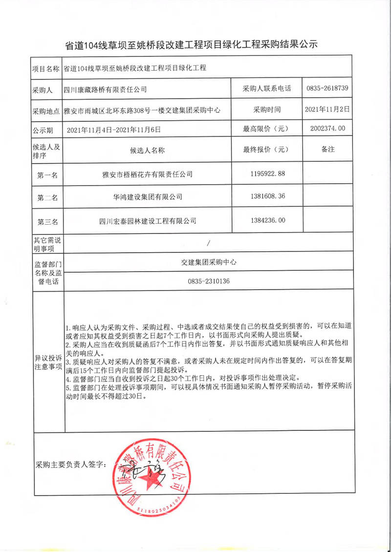 四川康藏路橋有限責(zé)任公司省道104線草壩至姚橋段改建工程項(xiàng)目綠化工程采購結(jié)果公示