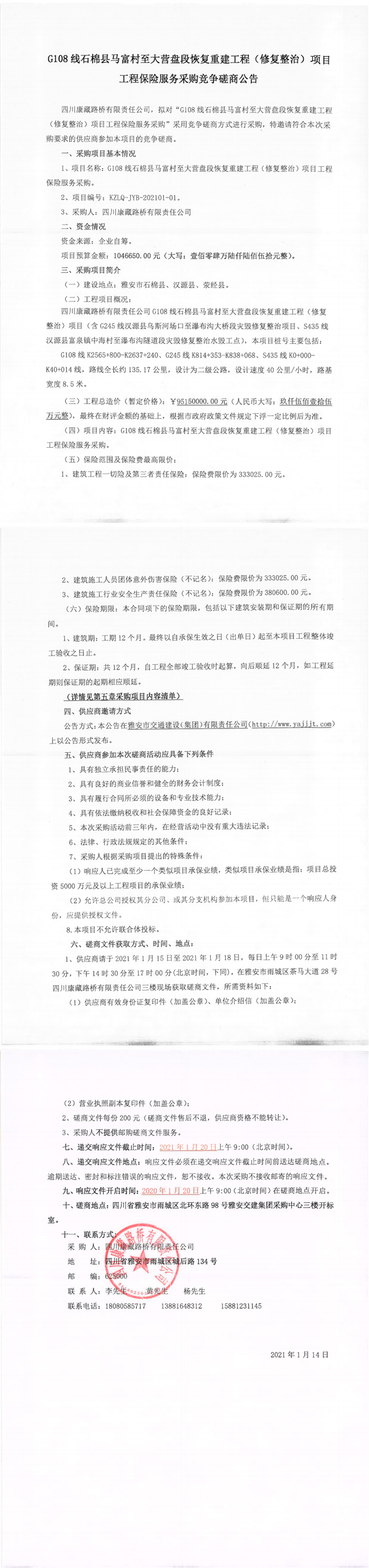 四川康藏路橋有限公司G108線石棉縣馬富村至大營盤段恢復重建工程(修復整治)項目工程保險服務采購競爭磋商公告