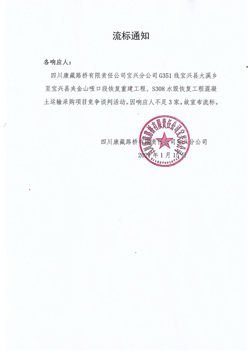 四川康藏路橋有限責(zé)任公司寶興分公司G351線寶興縣大溪鄉(xiāng)至寶興縣夾金山啞口段恢復(fù)重建工程、S308水毀恢復(fù)工程混凝土運輸采購項目流標(biāo)通知