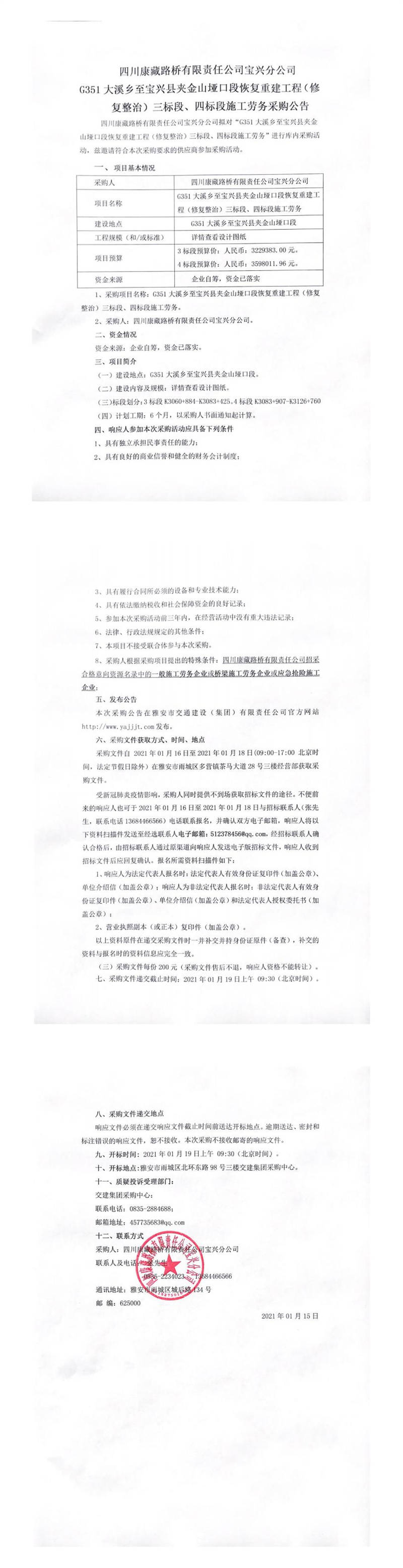 四川康藏路橋有限責任公司寶興分公司G351線寶興縣大溪鄉(xiāng)至寶興縣夾金山埡口段恢復重建工程(修復整治)三標段、四標段施工勞務采購公告