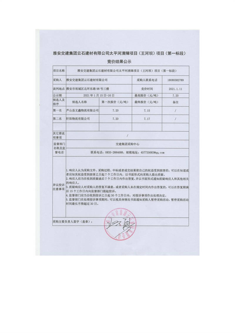 雅安交建集團(tuán)云石建材有限公司太平河清障項目(王河壩)項目(第一標(biāo)段)競價結(jié)果公示