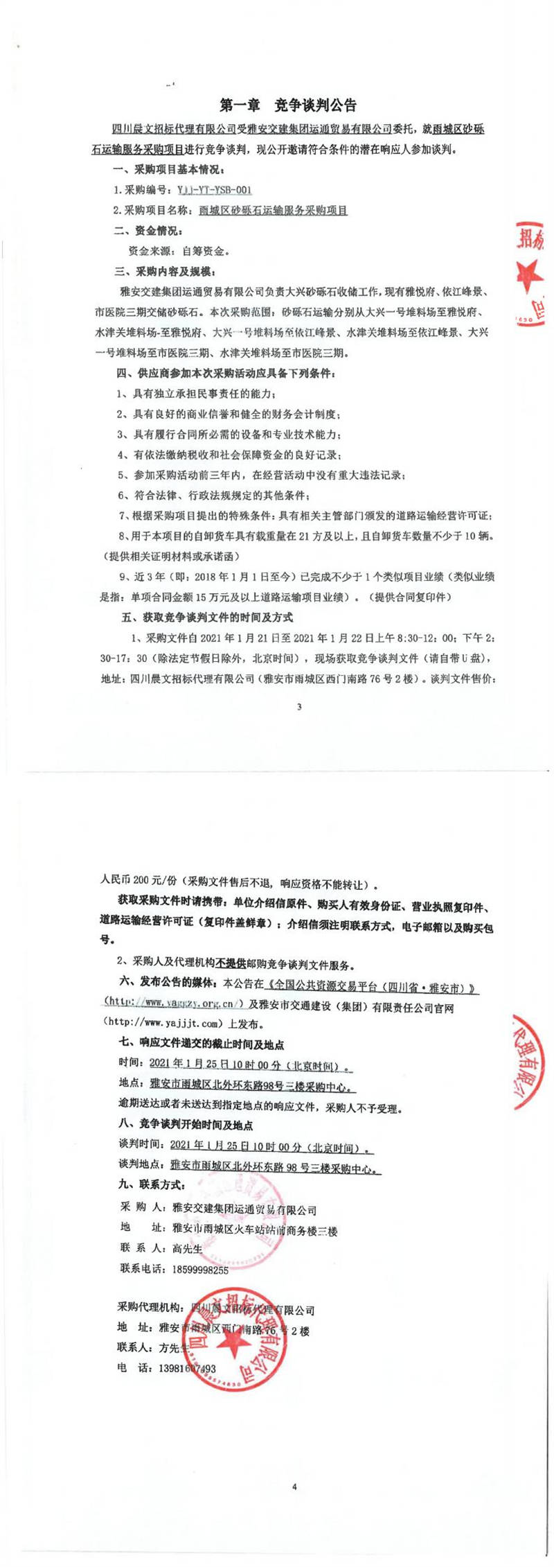 雅安交建集團運通貿易有限公司雨城區(qū)砂礫石運輸服務采購項目競爭談判公告