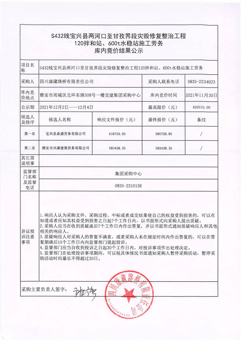 四川康藏路橋有限責任公司S432線寶興縣兩河口至甘孜界段災毀修復整治工程120拌和站、600t水穩(wěn)站施工勞務庫內(nèi)競價結(jié)果公示