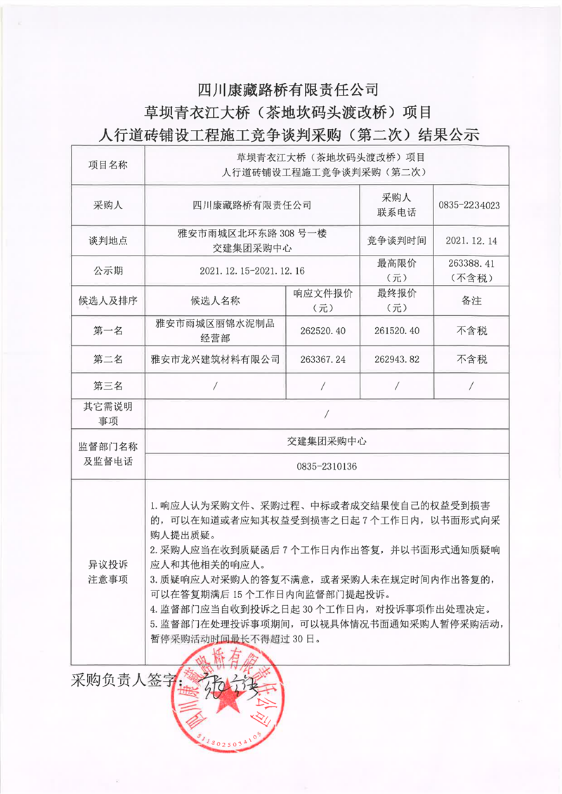 四川康藏路橋有限責任公司草壩青衣江大橋(茶地坎碼頭渡改橋)項目人行道磚鋪設工程施工競爭談判采購(第二次)結(jié)果公示