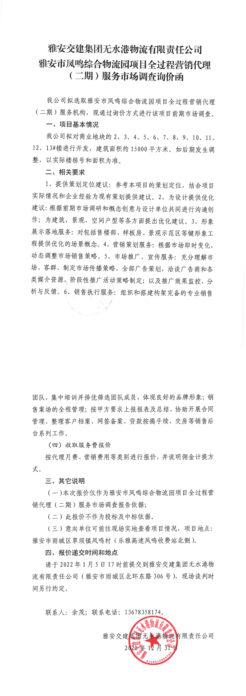 雅安交建集團無水港物流有限責任公司雅安市鳳鳴綜合物流園項目全過程營銷代理(二期)服務(wù)市場調(diào)查詢價函