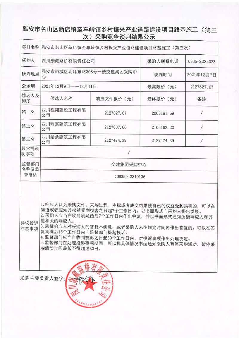四川康藏路橋有限責任公司雅安市名山區(qū)新店鎮(zhèn)至車嶺鎮(zhèn)鄉(xiāng)村振興產(chǎn)業(yè)道路建設項目路面施工(第三次)采購競爭談判結果公示