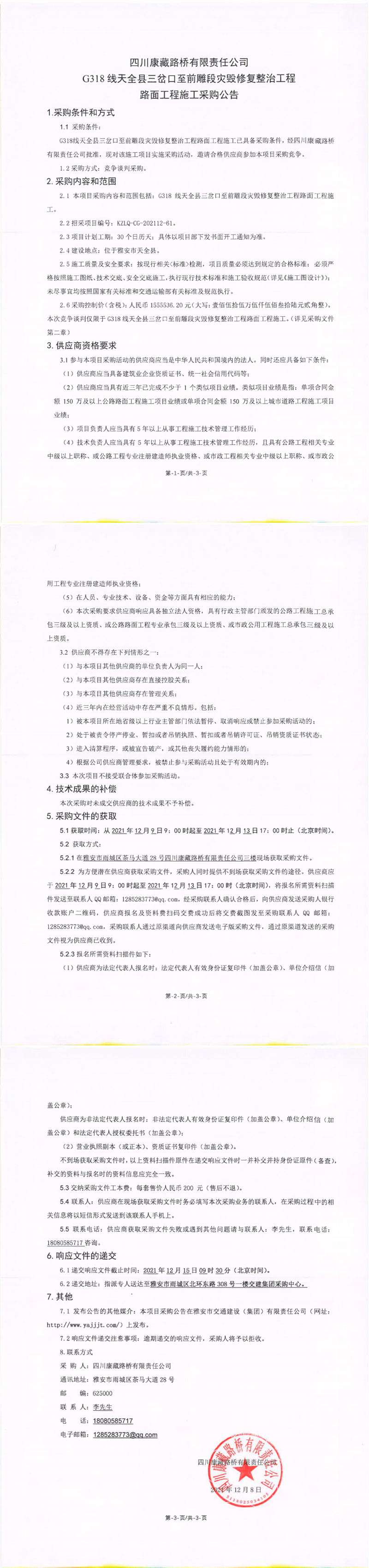 四川康藏路橋有限責(zé)任公司G318線天全縣三岔口至前雕段災(zāi)毀修復(fù)整治工程路面工程施工采購(gòu)公告