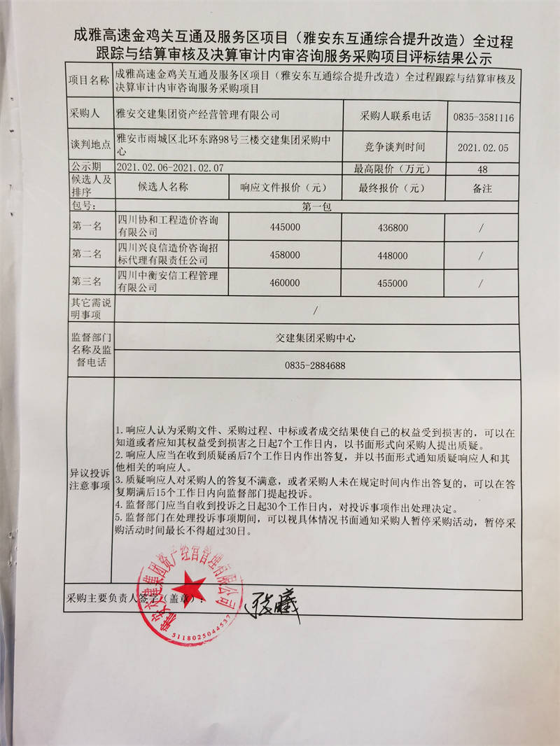 雅安交建集團資產經營管理有限公司成雅高速金雞關互通及服務區(qū)項目(雅安東互通綜合提升改造)全過程跟蹤與結算審核及決算審計內審咨詢服務評標結果公示