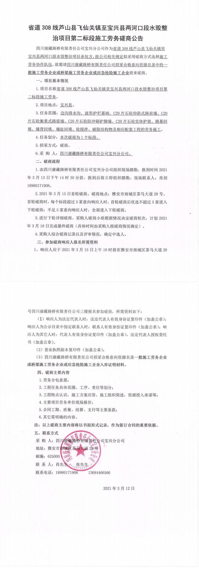 四川康藏路橋有限責(zé)任公司寶興分公司省道308線蘆山縣飛仙關(guān)鎮(zhèn)至寶興縣兩河口段水毀整治項(xiàng)目第二標(biāo)段施工勞務(wù)磋商公告