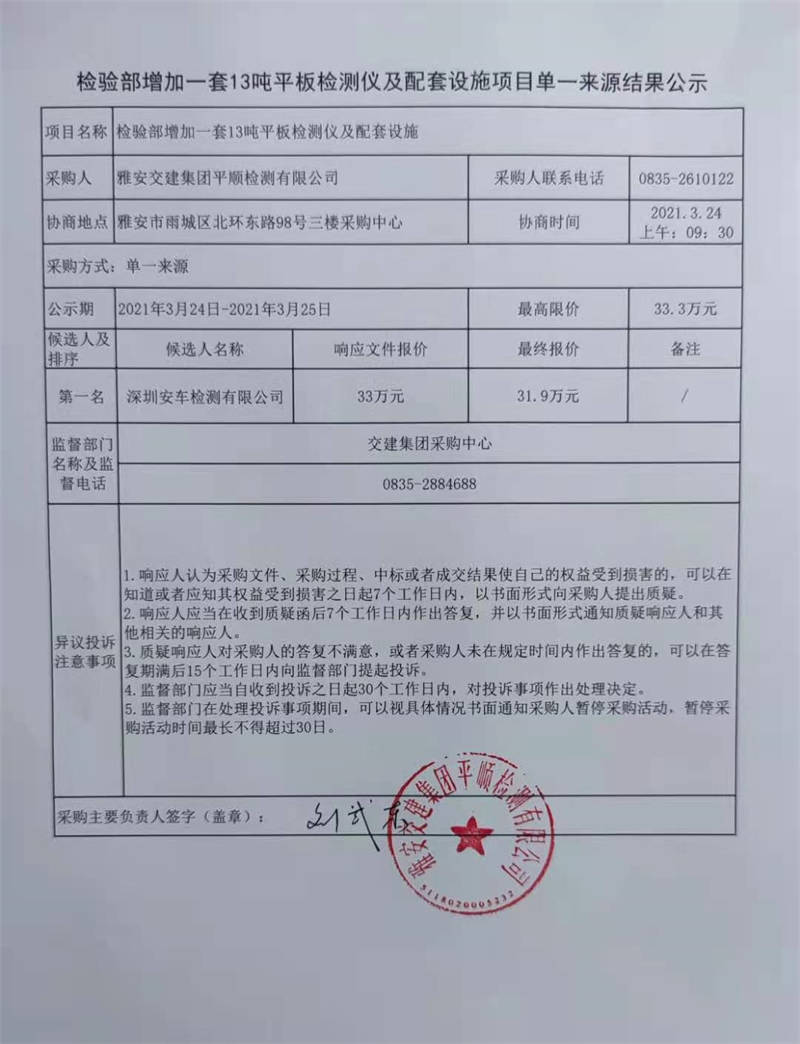 雅安交建集團平順檢測有限公司檢驗部增加一套13噸平板檢測儀及配套設(shè)施項目單一來源結(jié)果公示