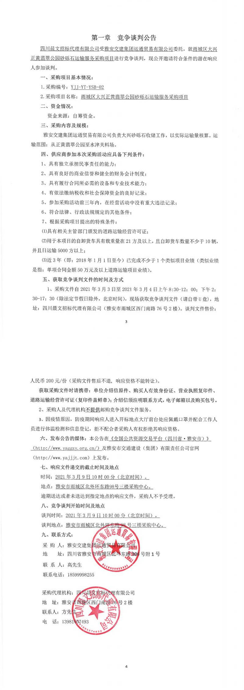 雅安交建集團(tuán)運(yùn)通貿(mào)易有限公司雨城區(qū)大興正黃翡翠公園砂礫石運(yùn)輸服務(wù)采購項(xiàng)目競(jìng)爭談判公告