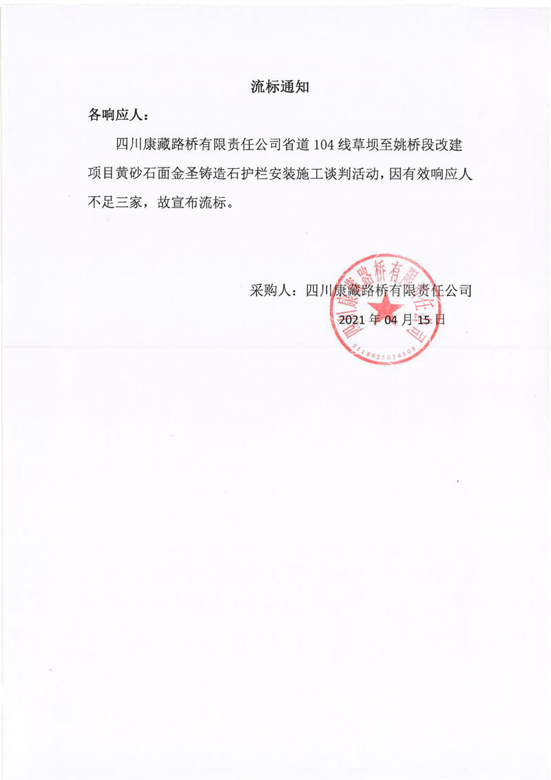 四川康藏路橋有限責(zé)任公司省道104線草壩至姚橋段改建項目黃砂石面金圣鑄造石護欄安裝施工流標通知