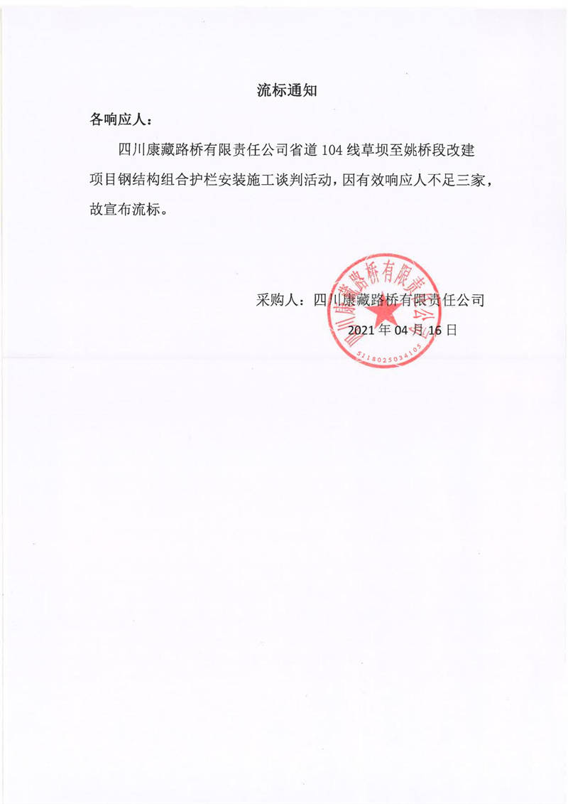 四川康藏路橋有限責(zé)任公司省道104線(xiàn)草壩至姚橋段改建項(xiàng)目鋼結(jié)構(gòu)組合護(hù)欄安裝施工流標(biāo)通知