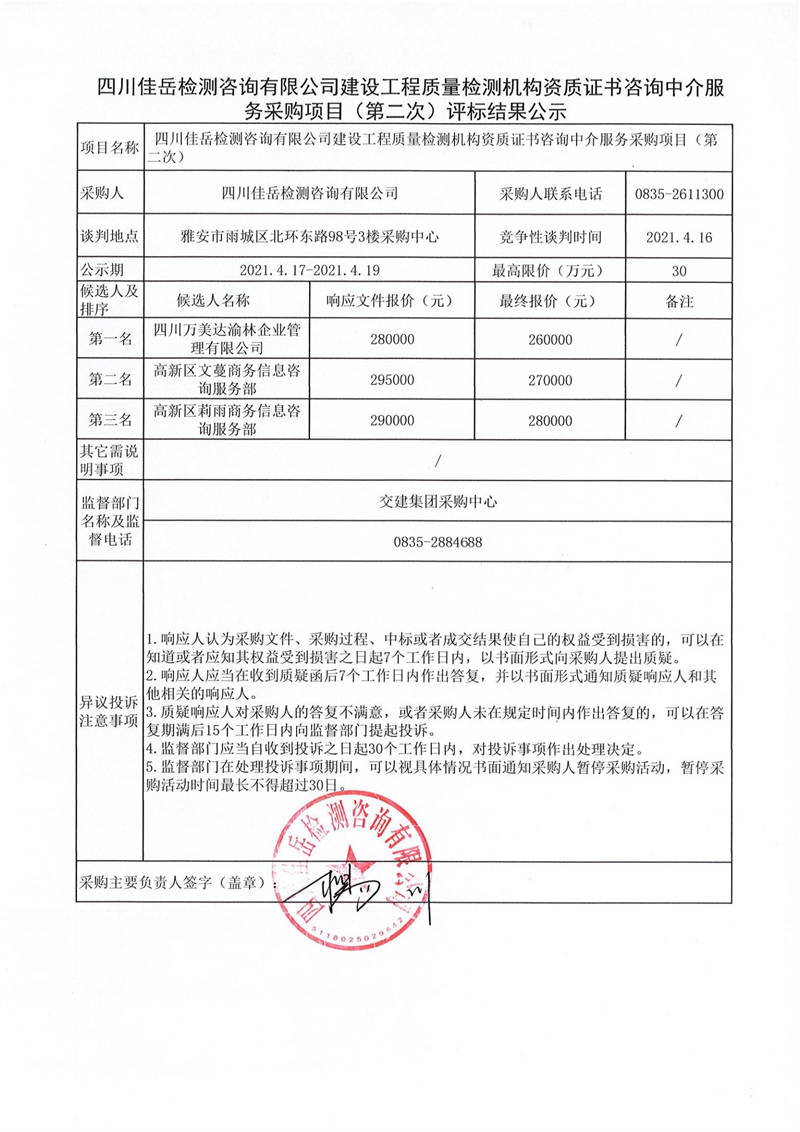 四川佳岳檢測咨詢有限公司建設(shè)工程質(zhì)量檢測機構(gòu)資質(zhì)證書咨詢中介服務(wù)采購項目(第二次)評標結(jié)果公示