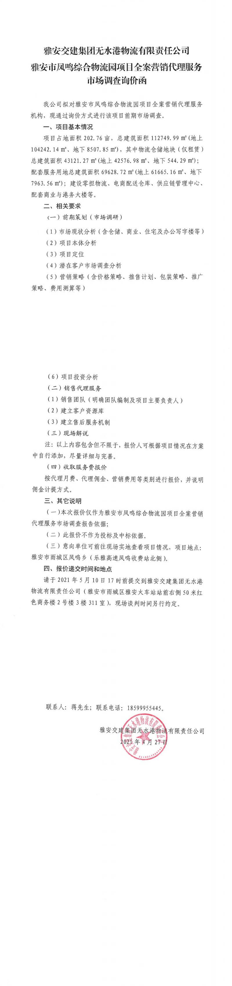 雅安交建集團(tuán)無水港物流有限責(zé)任公司雅安市鳳鳴綜合物流園項(xiàng)目全案營銷代理服務(wù)市場調(diào)查詢價(jià)函