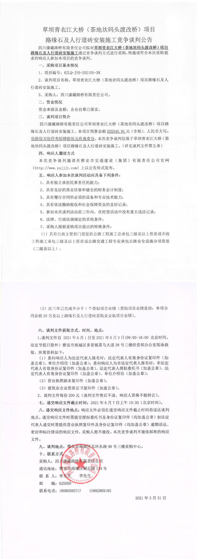 四川康藏路橋有限責(zé)任公司草壩青衣江大橋(茶地坎碼頭渡改橋)項(xiàng)目路緣石及人行道磚安裝施工競(jìng)爭談判公告