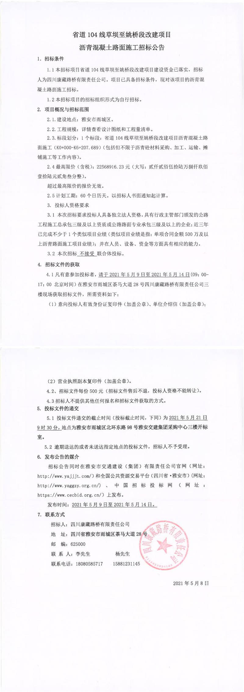 四川康藏路橋有限責(zé)任公司省道104線草壩至姚橋段改建項目瀝青混凝土路面施工招標(biāo)公告