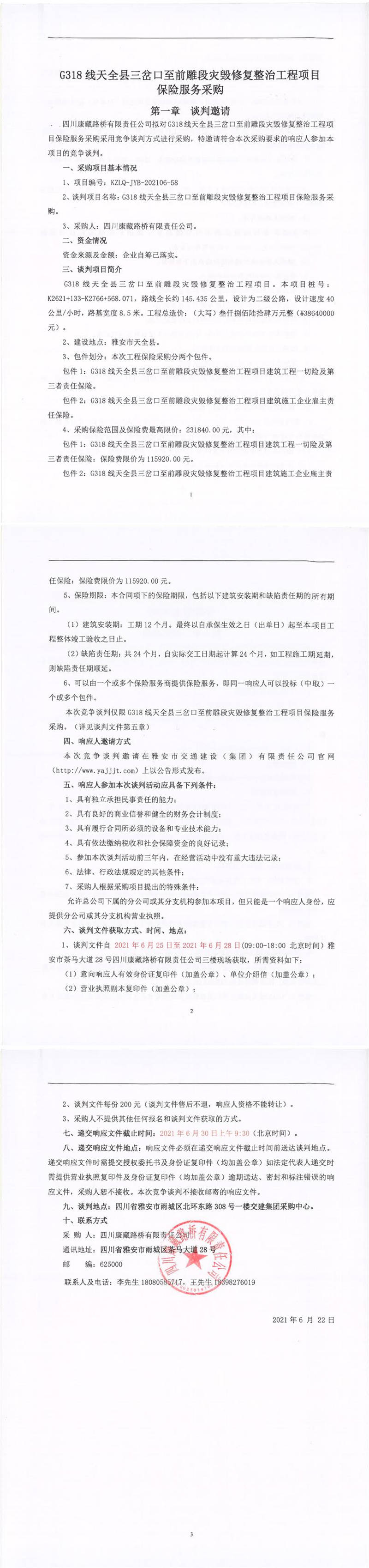 四川康藏路橋有限責任公司G318線天全縣三岔口至前雕段災毀修復整治工程項目保險服務采購競爭談判公告