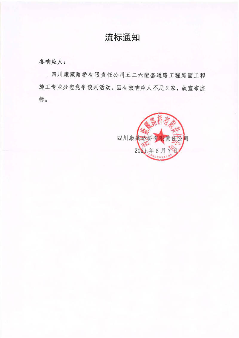 四川康藏路橋有限責(zé)任公司五二六配套道路工程路面工程施工專業(yè)分包競爭談判流標(biāo)通知