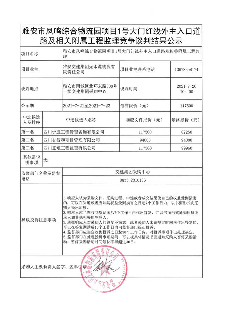 雅安交建集團無水港物流有限責任公司雅安市鳳鳴綜合物流園項目1號大門紅線外主入口道路及相關(guān)附屬工程監(jiān)理競爭談判結(jié)果公示