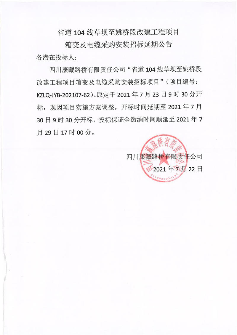 四川康藏路橋有限責(zé)任公司省道104線草壩至姚橋段改建項(xiàng)目箱變及電纜采購(gòu)安裝招標(biāo)延期公告