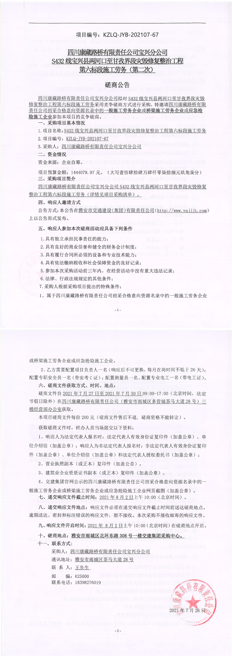四川康藏路橋有限責(zé)任公司S432線(xiàn)寶興縣兩河口至甘孜界段災(zāi)毀修復(fù)整治工程第六標(biāo)段施工勞務(wù)(第二次)競(jìng)爭(zhēng)磋商公告