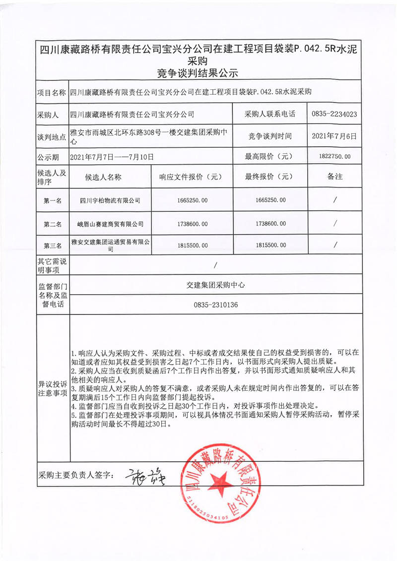 四川康藏路橋有限責任公司寶興分公司在建工程項目袋裝P.042.5R水泥采購競爭談判結果公示