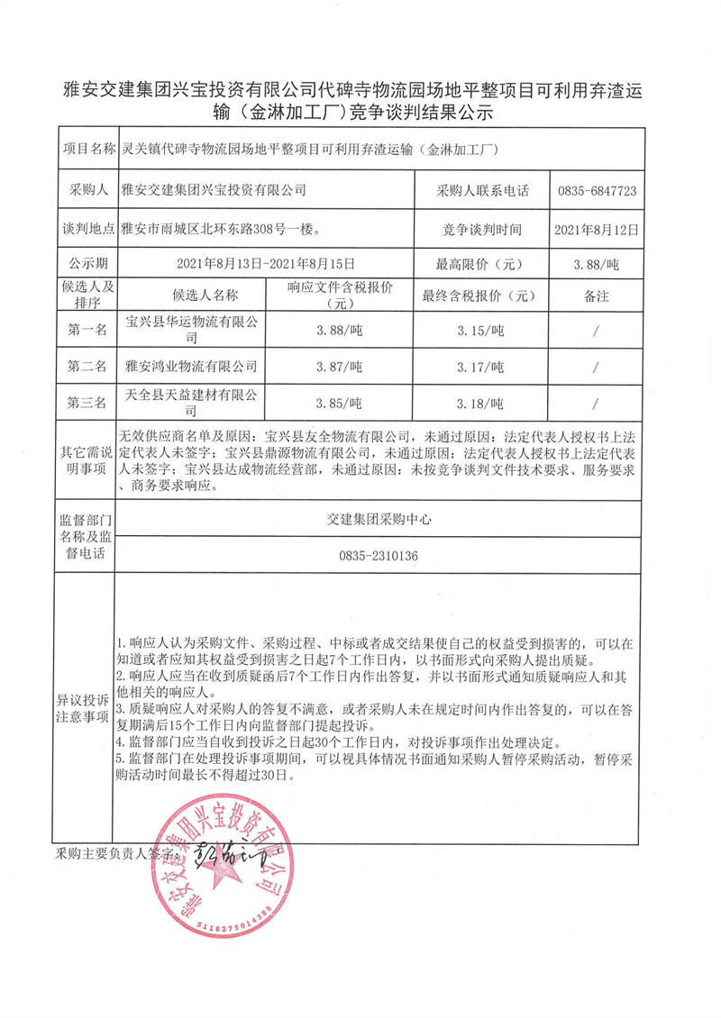 雅安交建集團(tuán)興寶投資有限公司代碑寺物流園場地平整項(xiàng)目可利用棄渣運(yùn)輸(金淋加工廠)競爭談判結(jié)果公示