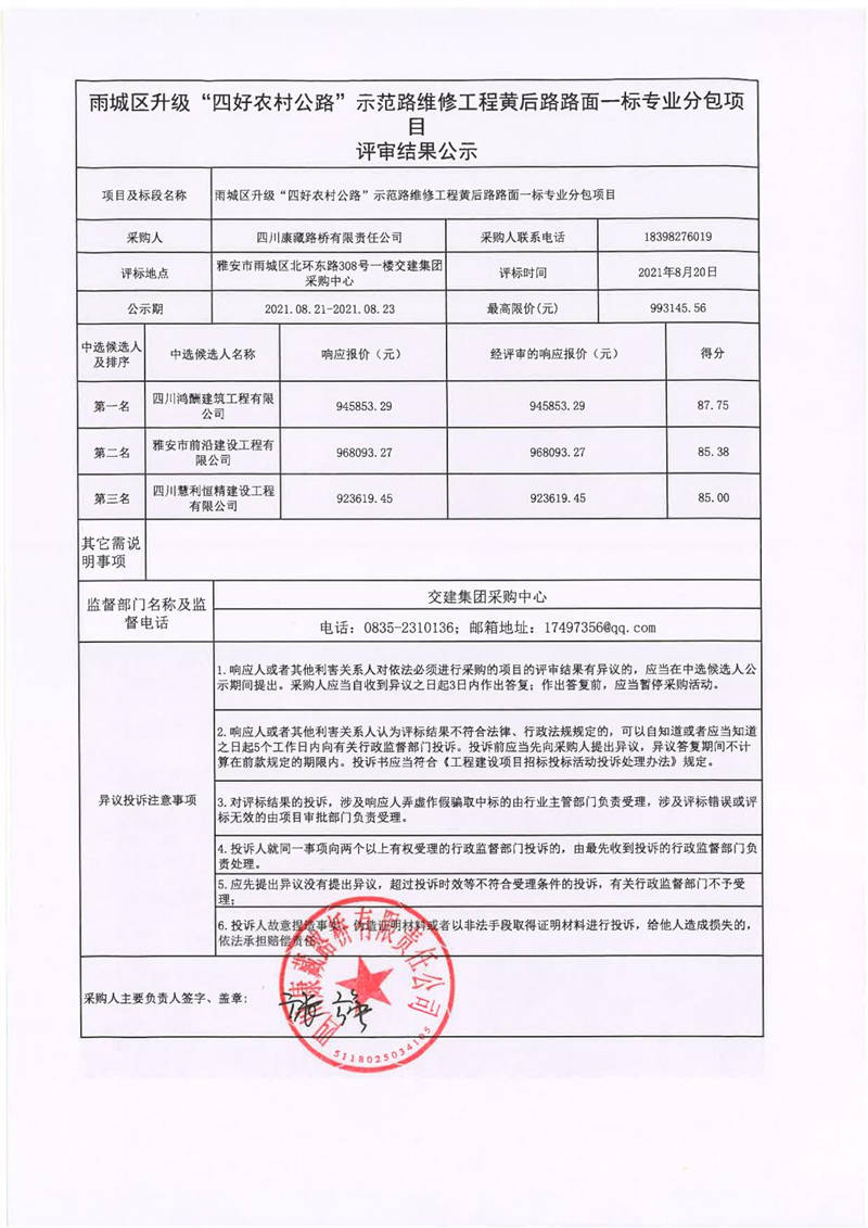 四川康藏路橋有限責(zé)任公司雨城區(qū)升級(jí)“四好農(nóng)村公路”示范路維修工程黃后路路面一標(biāo)專業(yè)分包項(xiàng)目評(píng)審結(jié)果公示