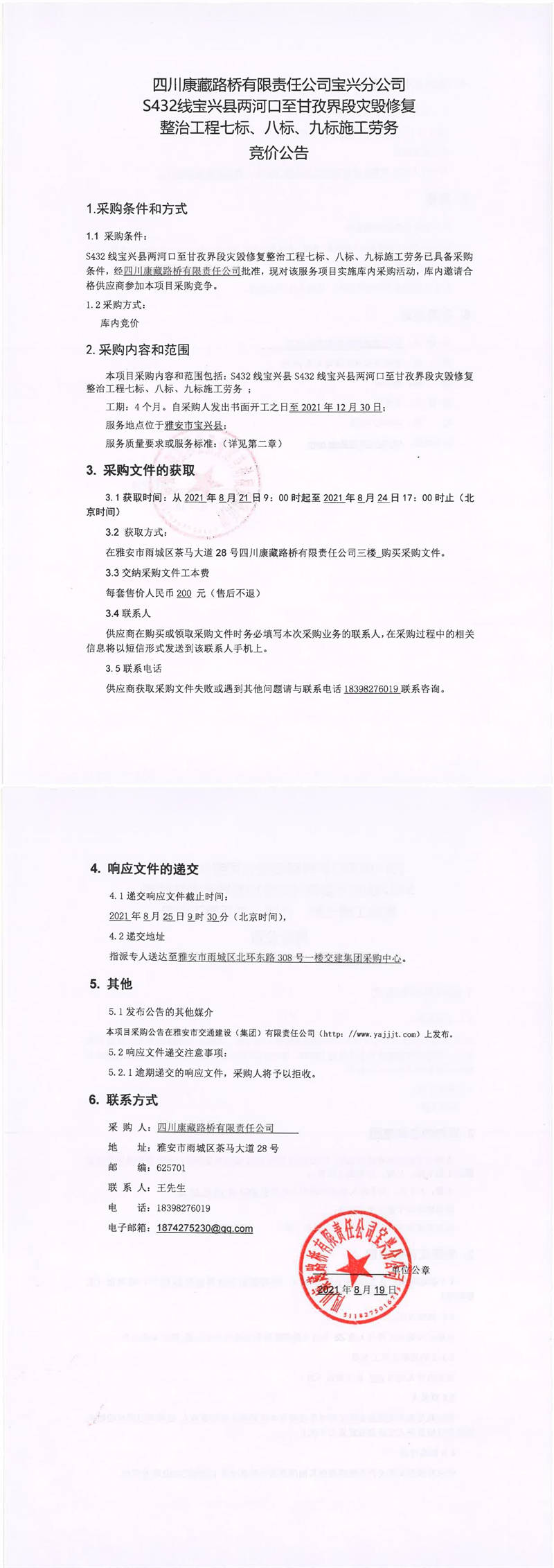 四川康藏路橋有限責(zé)任公司寶興分公司S432線(xiàn)寶興縣兩河口至甘孜界段災(zāi)毀修復(fù)整治工程七標(biāo)、八標(biāo)、九標(biāo)施工勞務(wù)競(jìng)價(jià)公告